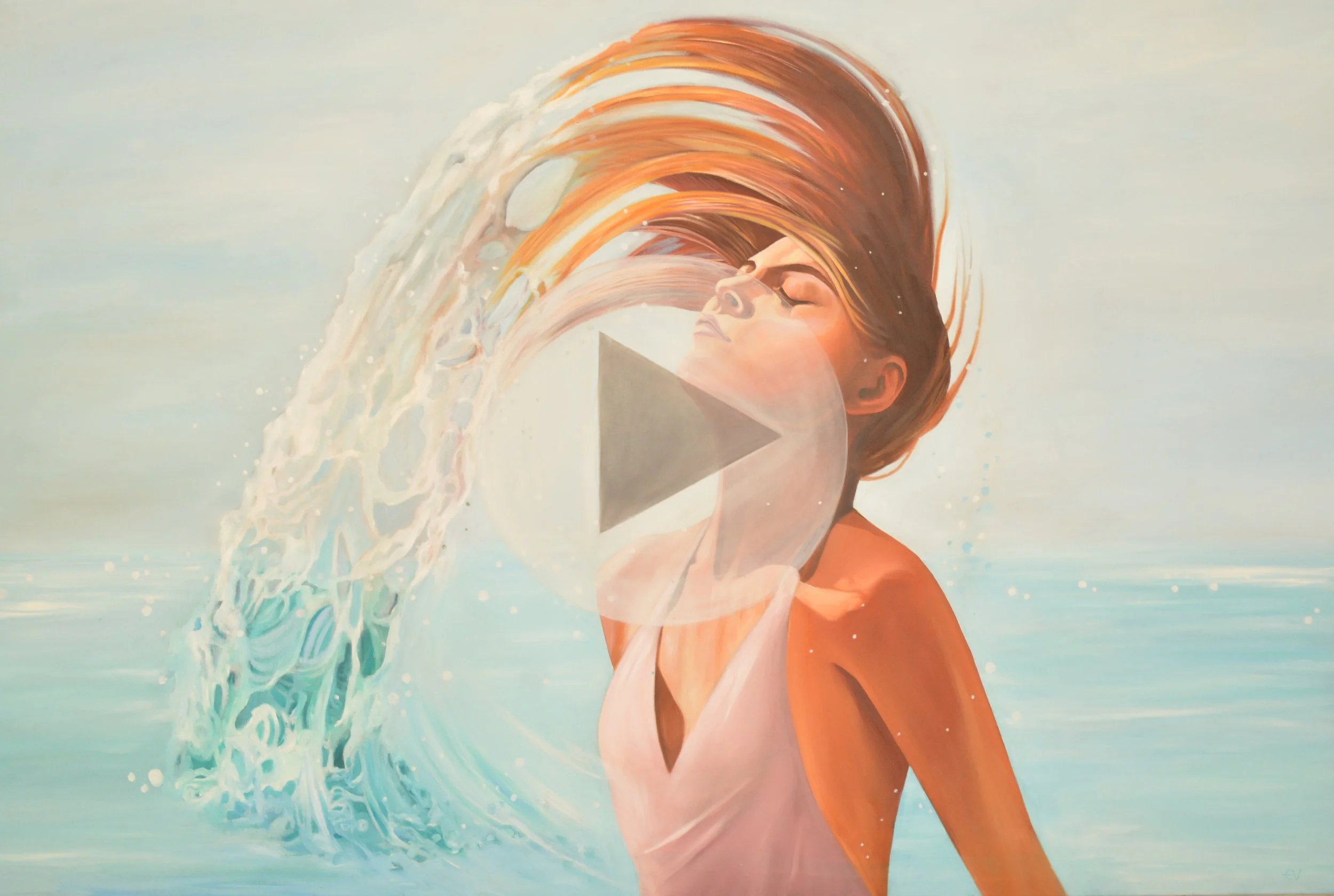 Pamela is one of the three girls in my painting Dancing Days. There is so much to explore when painting water. It is just fascinating how it can decompose a perfectly painted body and add that magical touch of reflections and sparkles through splashes and drops. The movement of the body is already explicit. Adding the Play logo was the fun part! As if you wanted to see more, you'll be moved to press the painted logo when accessing the image through a screen.